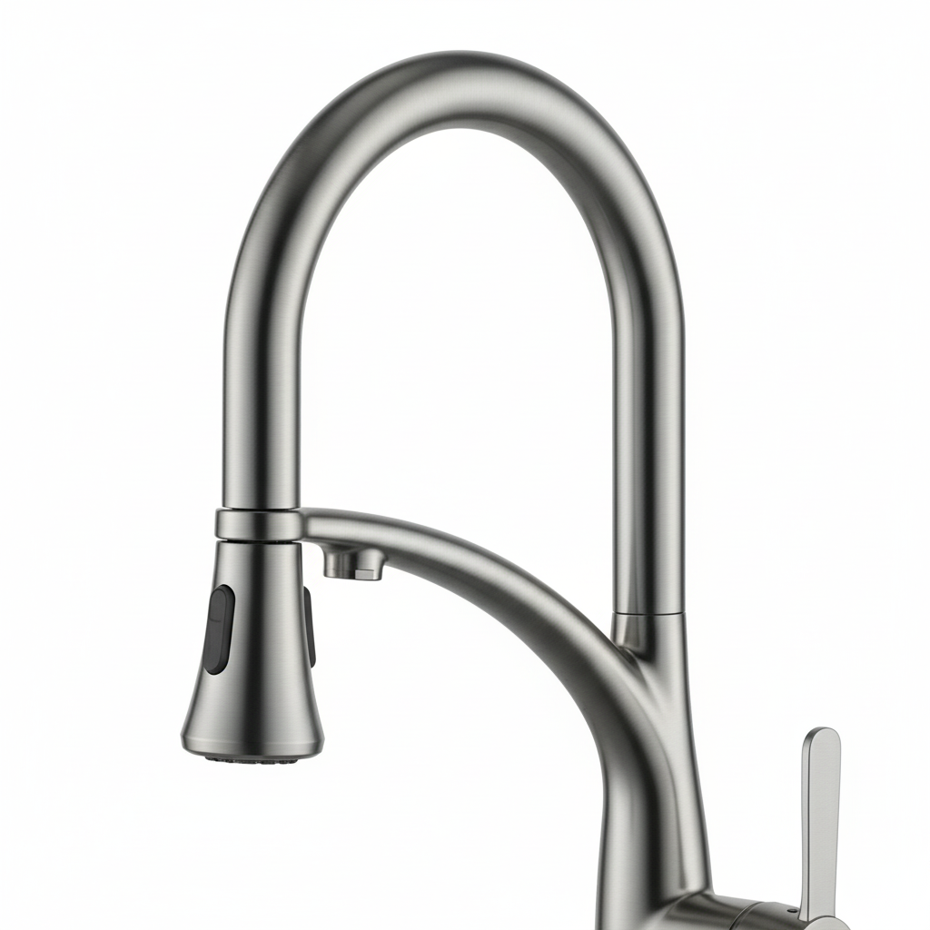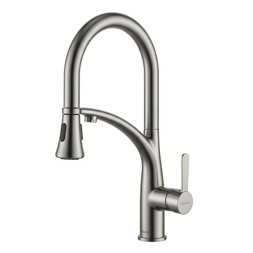 Upgrade your kitchen with the Zenquro Modern Pull-Down Faucet, where elegant design meets superior functionality. This stainless steel faucet combines a high-arc gooseneck spout with a versatile pull-down sprayer, making kitchen tasks smoother and more efficient. Its minimalist aesthetic is the perfect finishing touch for any modern kitchen renovation.
